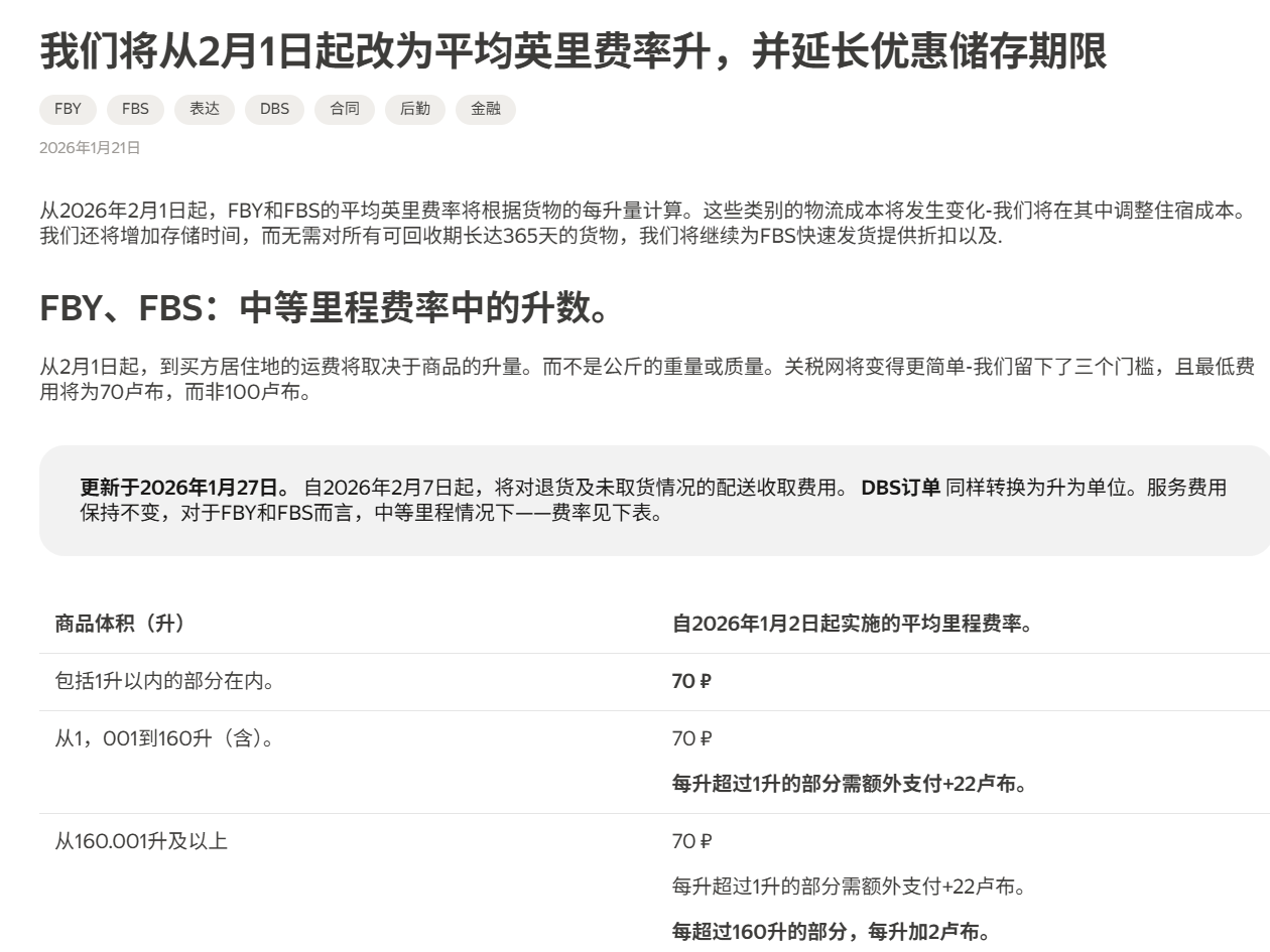 计费标准更新:自2026年2月1日起,FBY和FBS的平均里程费率将基于货物体积(升)计算,取代原有的按公斤或体积重量取大值的方式。体积计算公式为:长(厘米)×宽(厘米)×高(厘米)÷1000,结果向上取整至最近的整数升。
