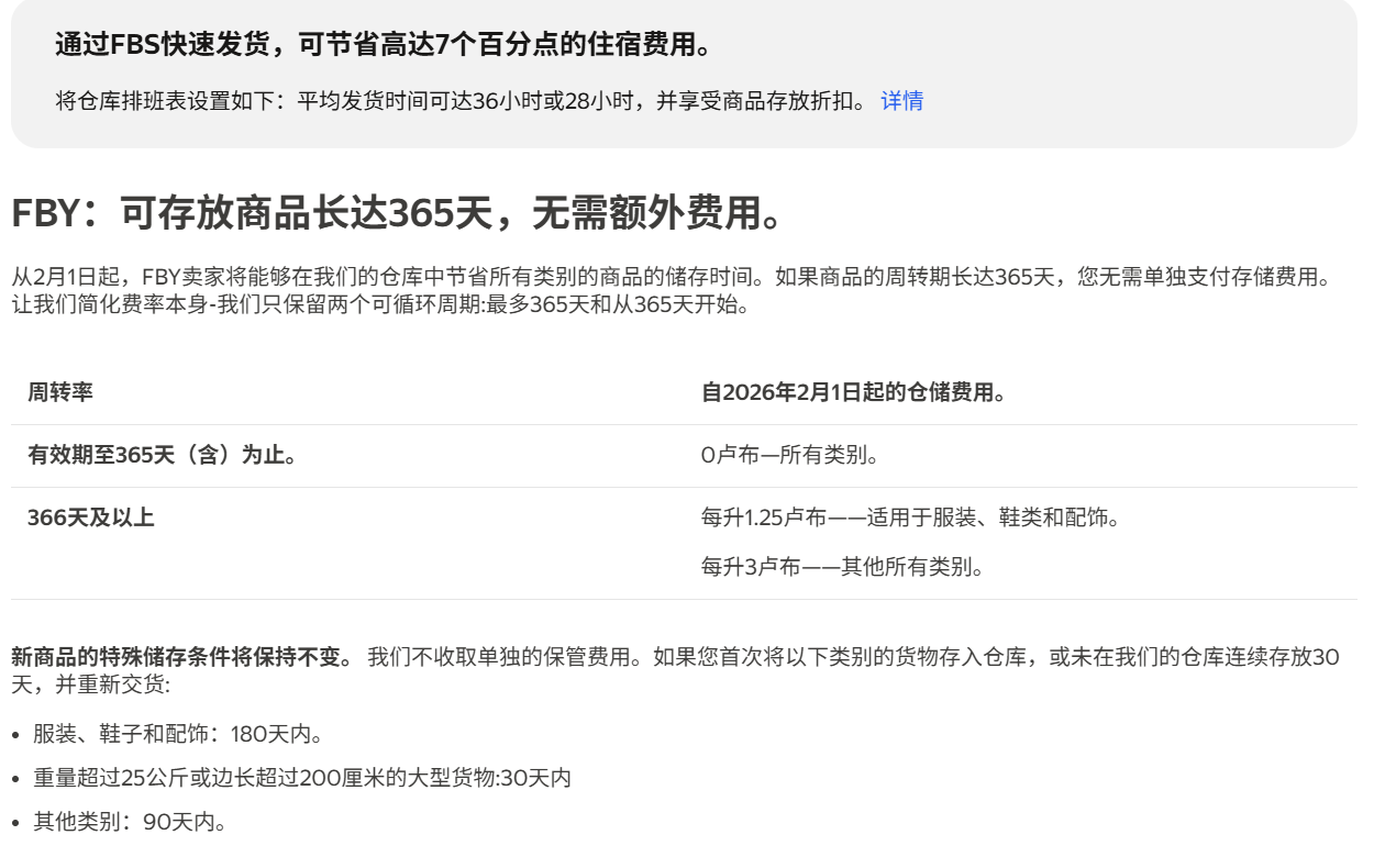 免费存储期延长:自2026年2月1日起,对于所有品类商品,只要在仓库中的储存周转期不超过365天(含),均不收取任何仓储费用。